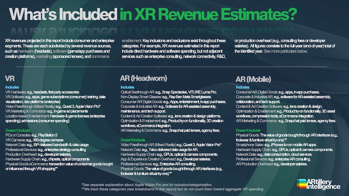 Like many research & intelligence firms, one of the things that ARtillery Intelligence does is market sizing. A few times per year, we go into isolation and bury ourselves deep in financial modeling. This exercise takes the insights and observations we accumulate throughout the year and synthesizes them into hard numbers for the current and future spatial computing industry (methodology details here).