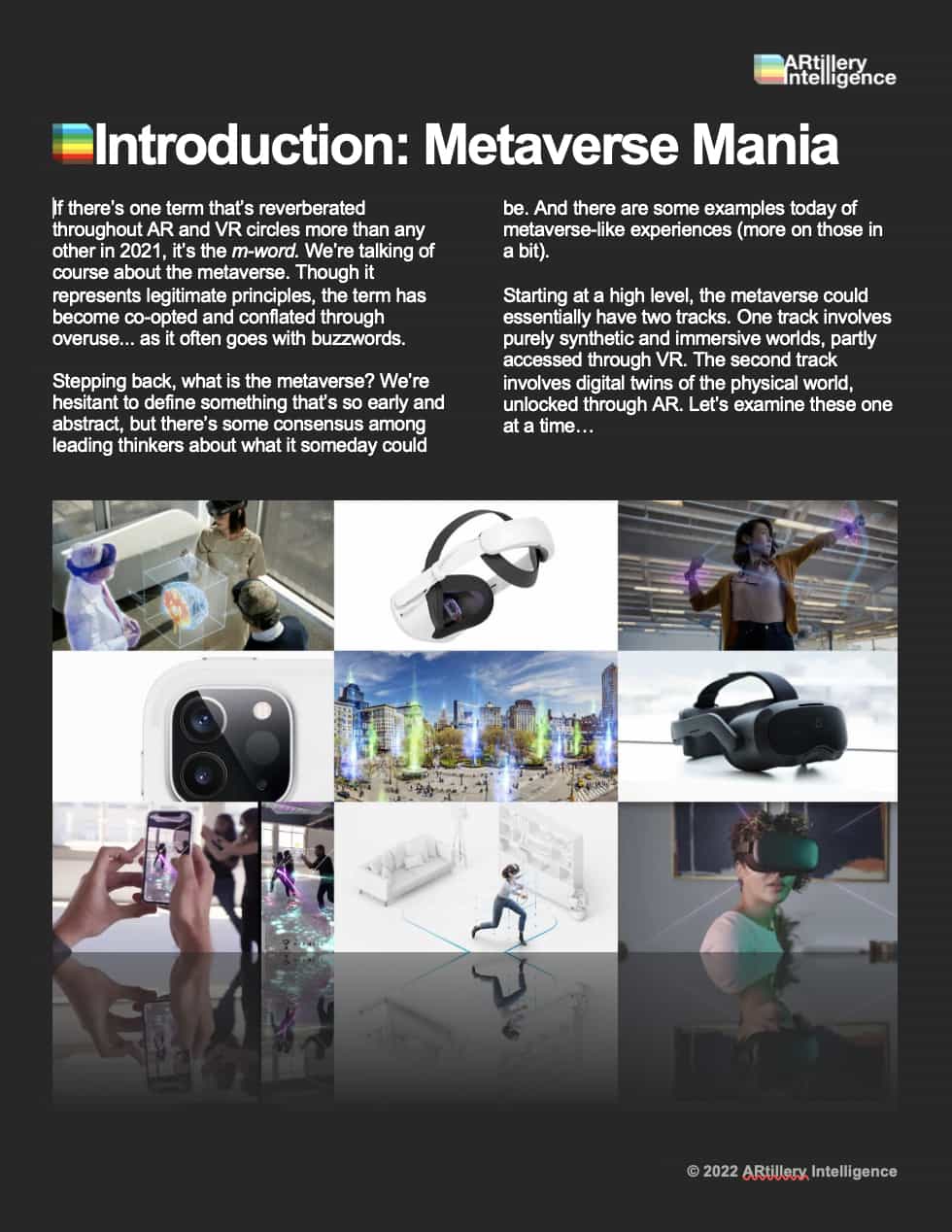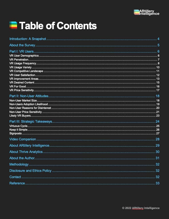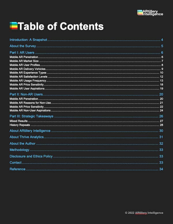This report highlights ARtillery Intelligence’s viewpoints, gathered from its daily in-depth coverage of spatial computing. To support the narrative, data are cited throughout the report. These include ARtillery Intelligence’s original data, as well as that of third parties. Data sources are attributed in each case.